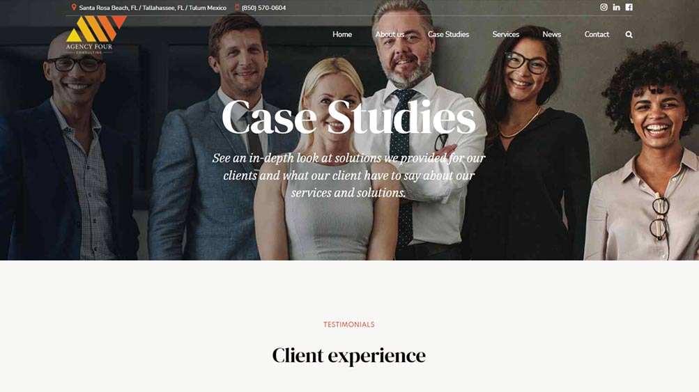 Overall, we are very proud of the website we provided for Agency 4. The final result was a modern, professional website that effectively communicates the company’s services and expertise to potential clients. The team at Agency 4 was extremely satisfied with the finished product, and we are confident that it will help them to attract new clients and grow their business in the Santa Rosa Beach and Tallahassee areas.”
