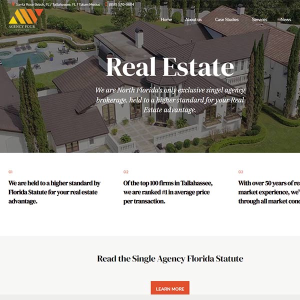 “Agency 4 is a real estate and consulting firm based in Santa Rosa Beach and Tallahassee, Florida. With a focus on global expertise and local insight, the team at Agency 4 helps clients turn their ambitious goals into reality. When they approached us to redesign their website, they were looking for a modern, professional website that would showcase their services and help them stand out in a competitive market.