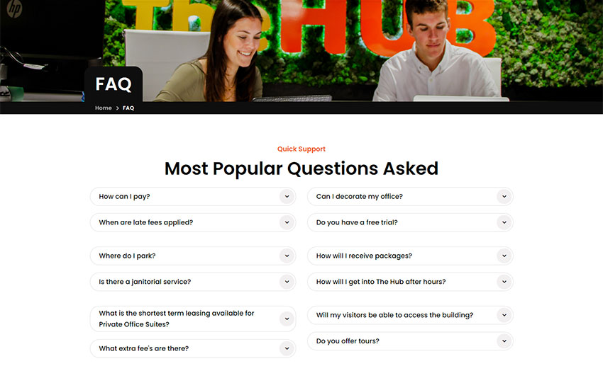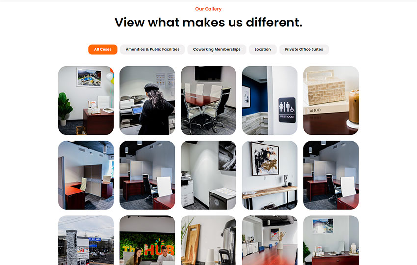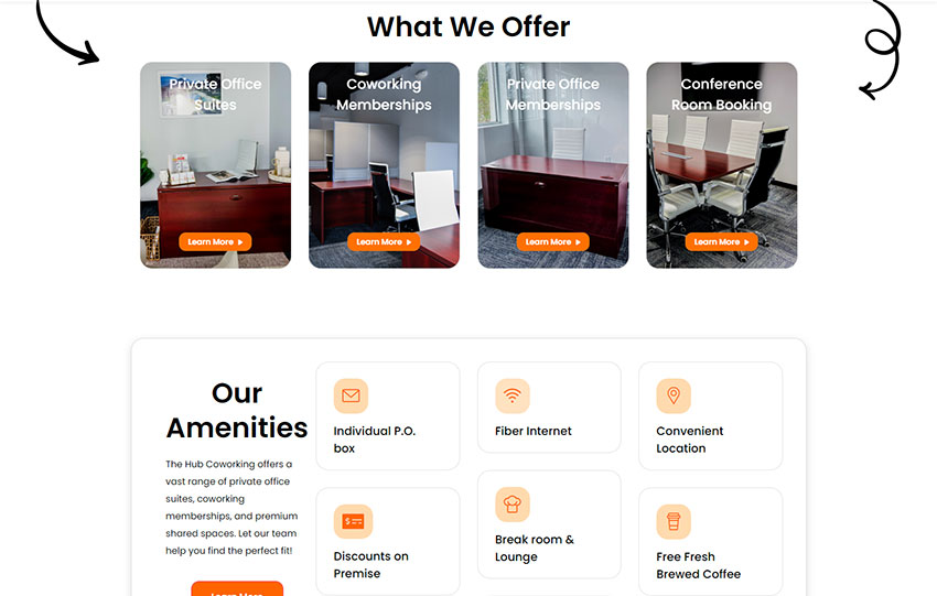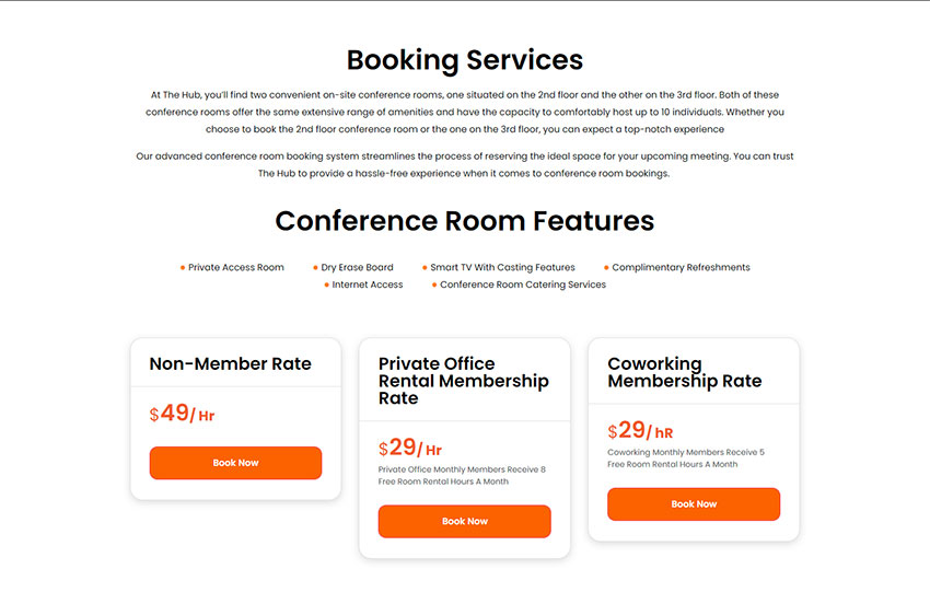 • Membership Options: Detailed information about coworking memberships, private office suites, and conference room reservations.